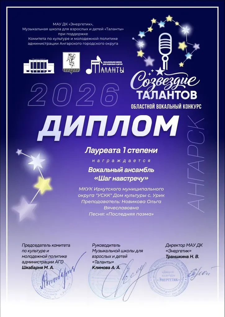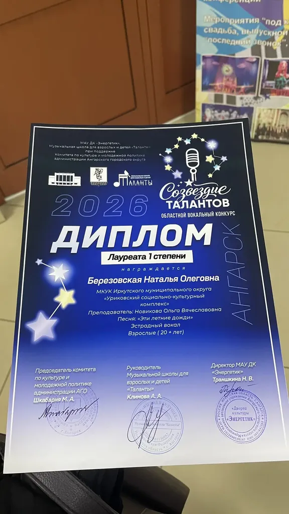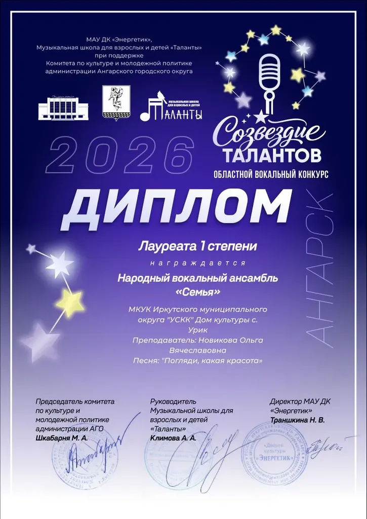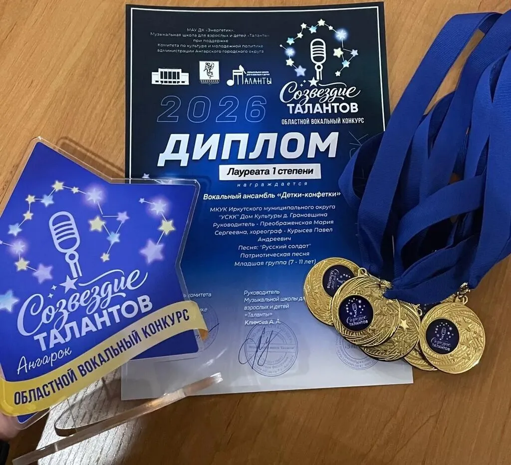 23 апреля детский вокальный ансамбль "Детки-конфетки", солистка вокального ансамбля "Шаг навстречу" Наталья Березовская, народный вокальный ансамбль "Семья" и вокальный ансамбль "Шаг навстречу" стали победителями областного вокального конкурса «Созвездие талантов», который прошел в г.Ангарске в Дворца культуры "Энергетик".